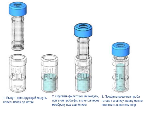 Экономичная одношаговая фильтрация пробы в одно движение! Совместимы со стандартными автосамплерами! Фильтр+виала+септа в одном устройстве!